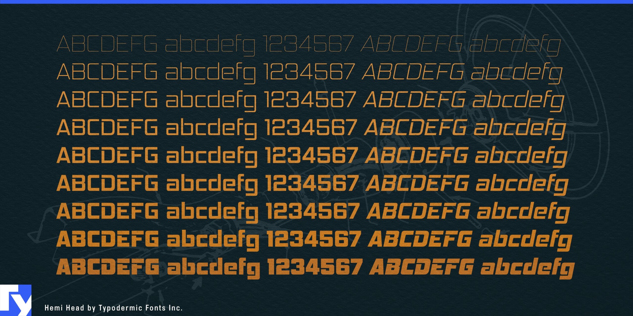 Hemi Head takes its cue from the blocky, aggressive lettering of classic American muscle cars, but it’s more than a nostalgia trip. Its squarish geometry, angled terminals, and clean counters combine to create letterforms that look fast, solid, and precise…built for impact without sacrificing legibility.