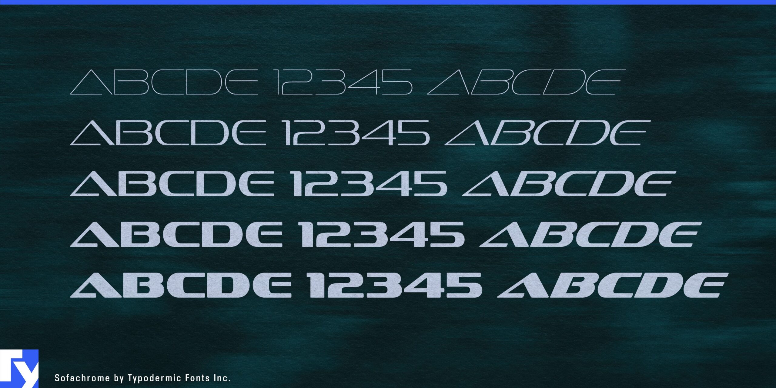 Sofachrome is built for the future. Its extended letterforms and geometric contours channel the precision of engineered surfaces, giving words a sleek, industrial edge. With five weights and matching italics, the family moves effortlessly from the quiet authority of the lighter styles to the commanding presence of the boldest cuts.